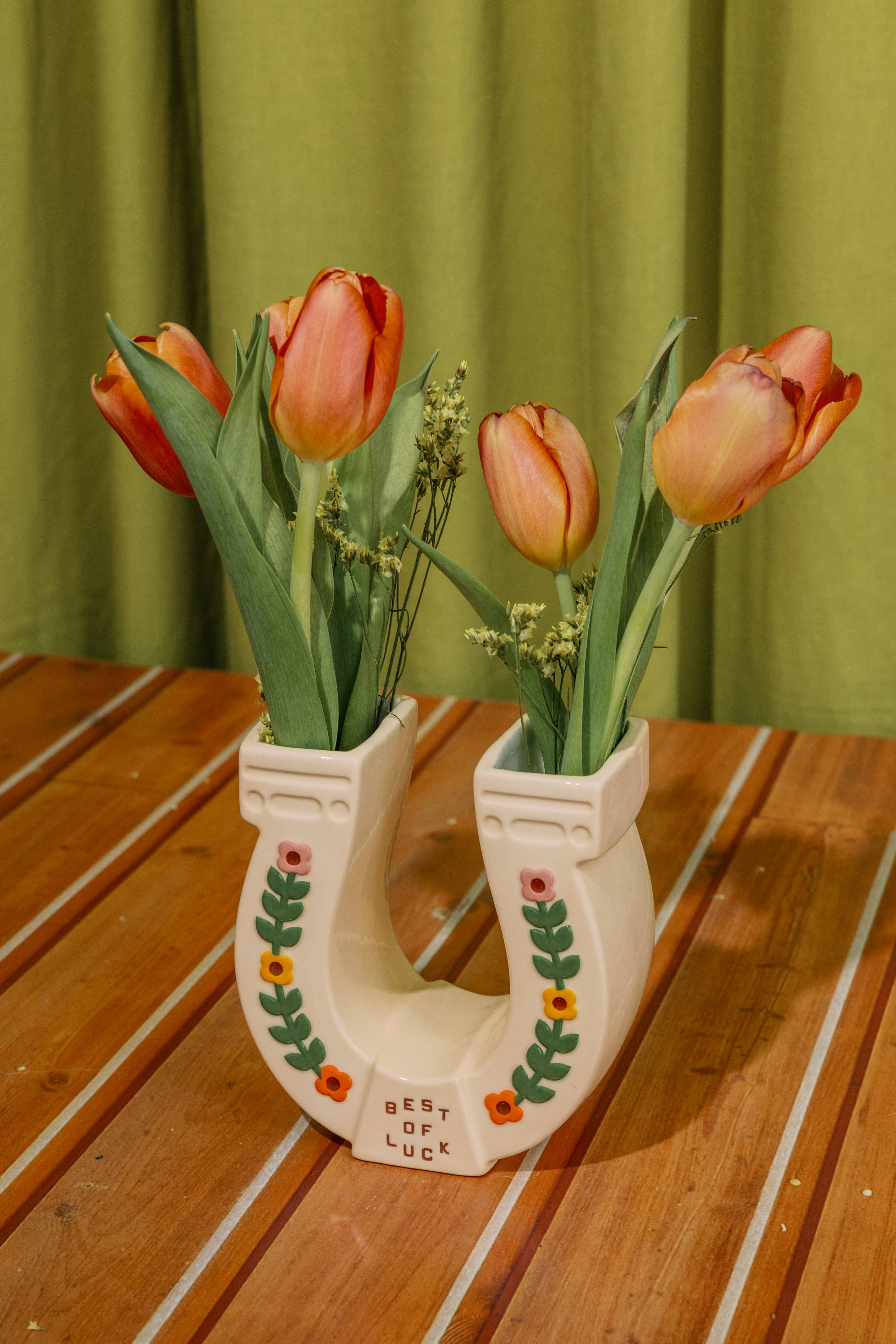 Lucky you. You just stumbled upon a ceramic horseshoe vase. Add a few stems to each side for a charming floral moment, or fill it with pens and pencils to brighten up your desk. Whether styled as décor or used as a functional organizer, this vase brings a little extra luck (and a lot of personality) to any space.