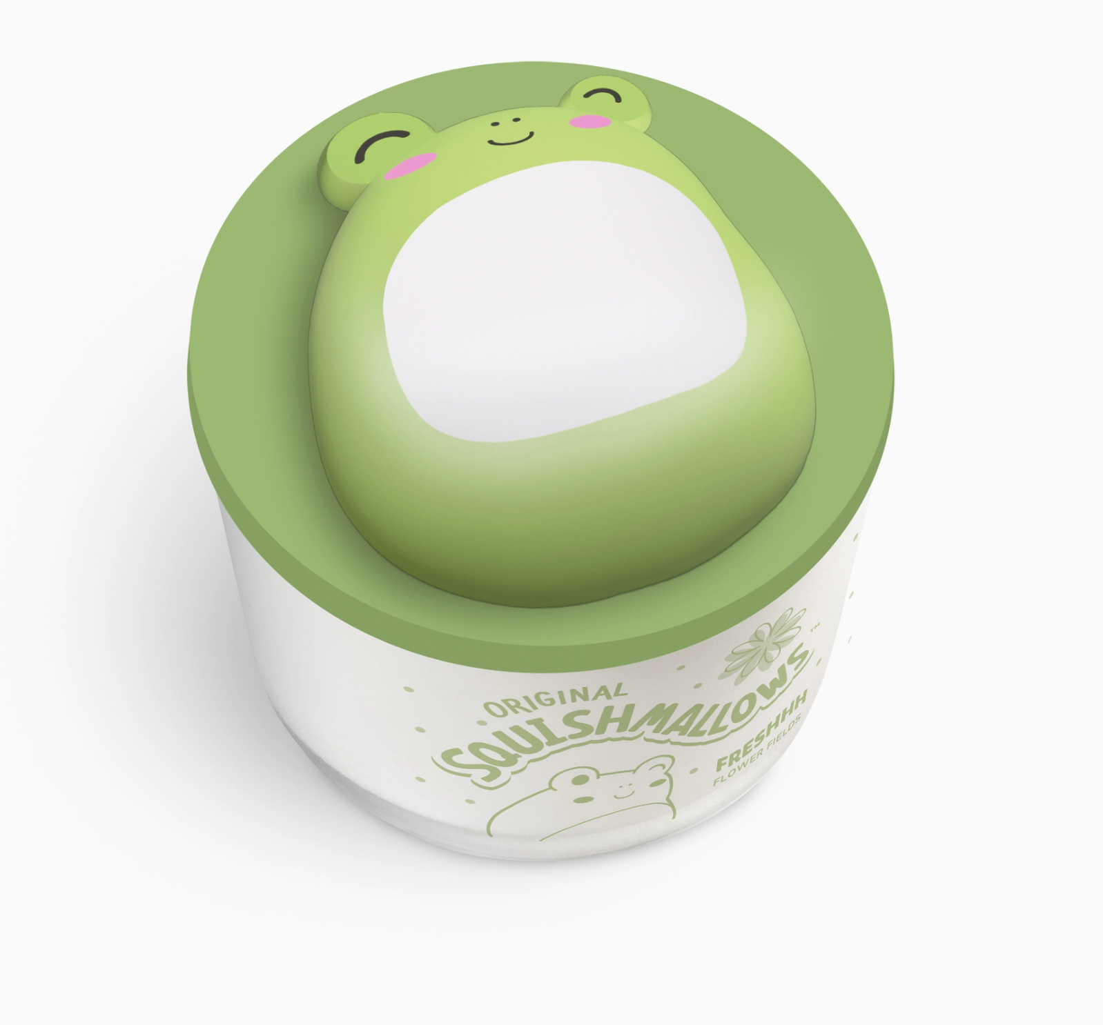 Showcases a beloved Squishmallows and coordinating scent • Includes a squishable puff on the painted wood lid • Comes in a reusable glass vessel Scent: Clean citrus notes complement an intoxicating blend of freshly cut greenery and dewy woodland florals with a delicate hint of white musk.