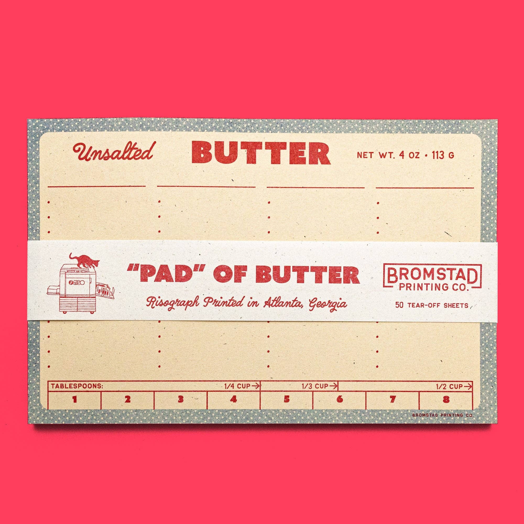 Oh wait no it is this butter notepad! Four columns where you can fill in your own custom headers and above bulleted spaces to list items to make your next trip to the grocery store smooth as butter. Risograph printed in bright red and federal blue with red glue on the left edge.