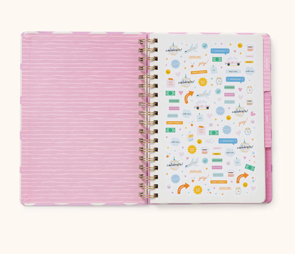 Designed with simplicity and convenience in mind, the Undated Tri-Tab Planner offers the flexibility to start planning at any time you choose. Its undated format means you can jump in whenever you’re ready, making it perfect for year-round productivity! Three tabbed dividers allow you to quickly turn to the section you need, whether it’s tracking your goals and priorities or utilizing the lined pages for note-taking. Each divider includes a pocket for storing receipts, lists, cards, and other loose notes. The sturdy cover and wire-o binding allow the planner to lie flat as you write, while the elastic band serves as both a secure closure and page marker. Plus, colorful die-cut stickers add a fun touch to your planning routine!