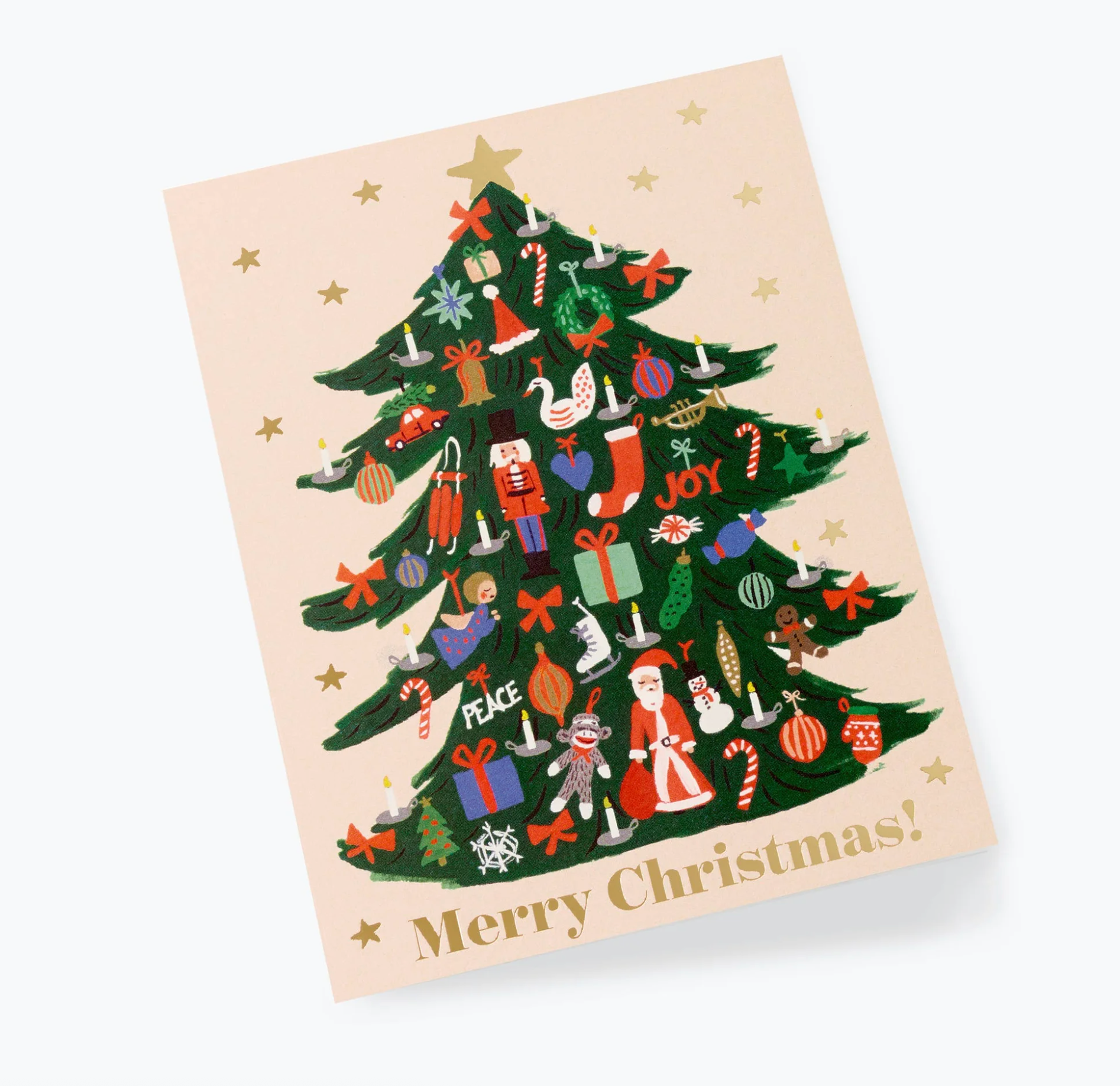 - 4.25" L × 5.5" W - Natural white cover paper - Printed in full color and foil stamped - Metallic gold foil - Metallic gold envelope - Blank interior - Set of 8 cards